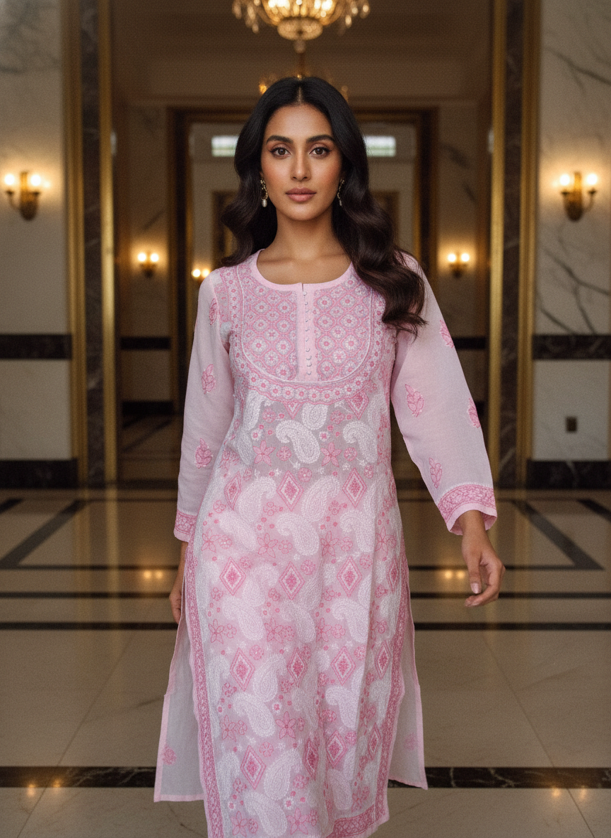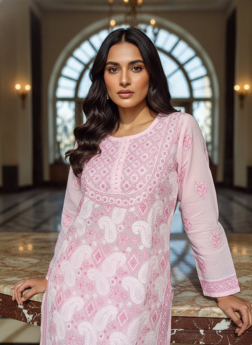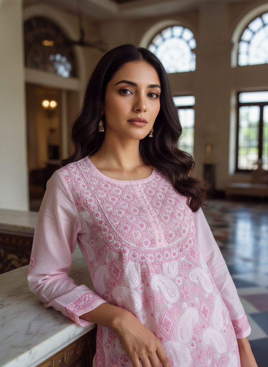 Gulnaar-e-Lucknow ek soft, elegant Chikankari kurti hai jo Lucknow ki tehzeeb aur nazaakat ko reflect karti hai. Iska delicate gulabi rang aur fine embroidery isse everyday elegance aur special moments dono ke liye perfect banata hai.