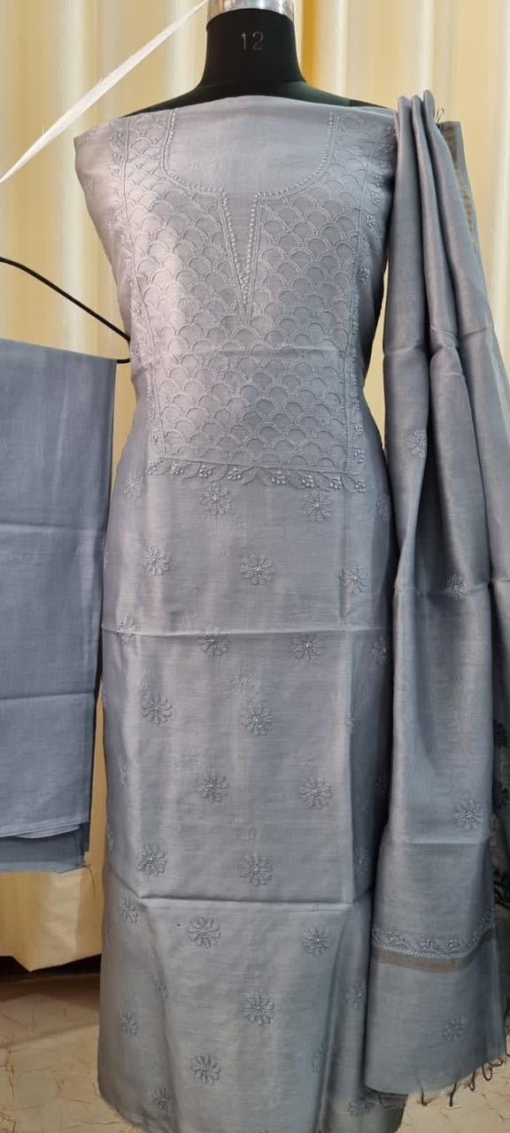 This exquisite suit set is crafted in pure Chanderi silk, known for its soft sheen and lightweight elegance. Adorned with authentic Lucknowi Chikankari embroidery and enhanced with delicate Teeki Mukesh work, it reflects refined artistry and understated luxury.